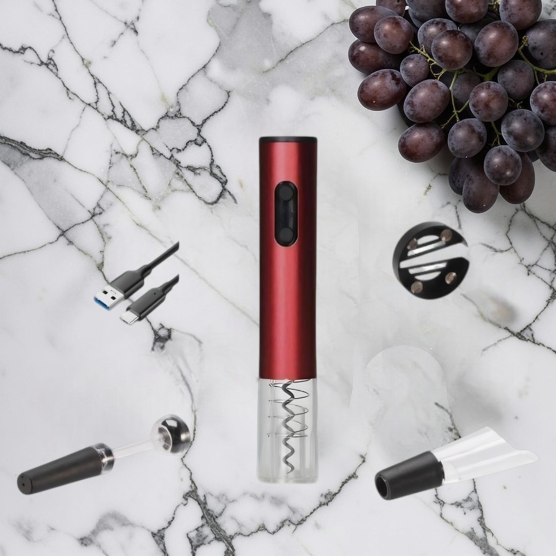 Um abridor de vinho recarregável USB é uma ferramenta prática e moderna, projetada para abrir garrafas de vinho com facilidade. Possui um design ergonômico, que facilita o manuseio e a operação. A recarga via USB proporciona conveniência, eliminando a necessidade de pilhas descartáveis. Os benefícios incluem eficiência na abertura, redução de esforço físico e sustentabilidade, ao minimizar o uso de baterias. Junto neste kit temos o cortador de lacre, tampa de preservação, aerador e cabo USB.