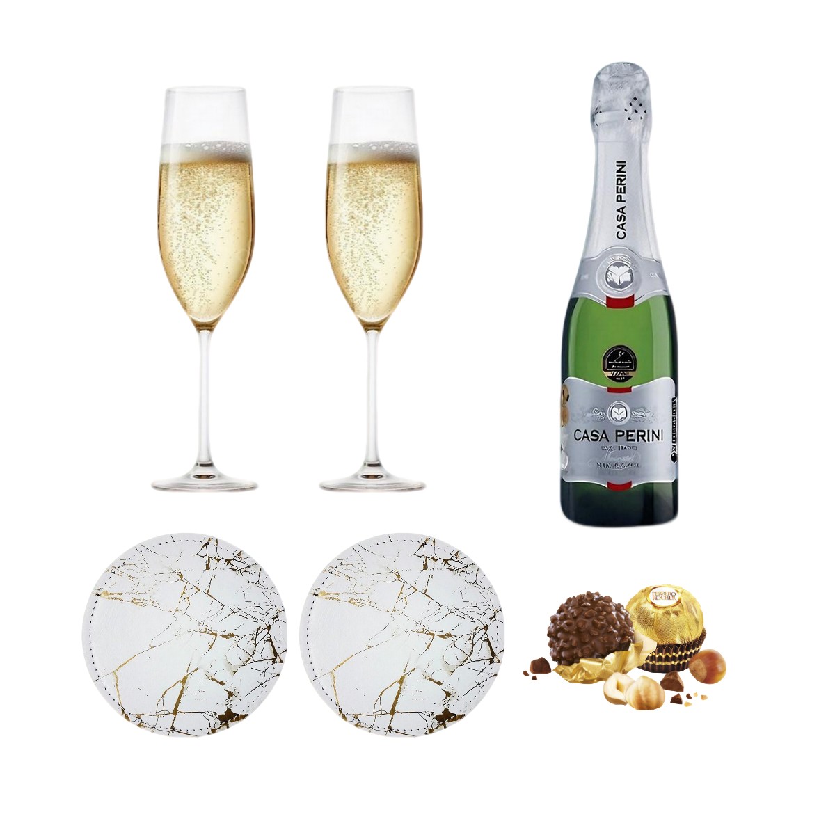 Nesse kit temos duas taças incríveis e com um design muito confortável, você vai surpreender seus convidados, resistente e fácil de limpar. Juntos acrescentamos dois porta taças bem charmosos e chocolates deliciosos. O espumante Moscatel é um vinho doce feito da uva Moscatel, conhecida por seu aroma floral e notas frutadas.